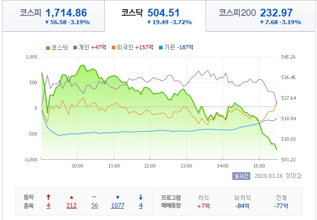 2020년 3월 16일 국내증시2020년 증시기록 2020. 3. 16. 16:41