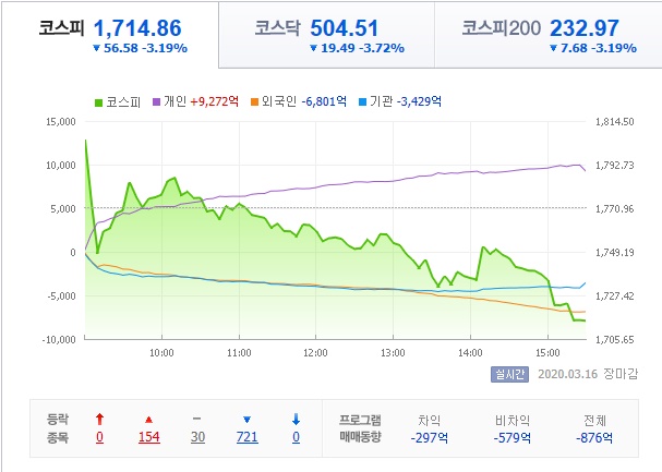 2020년 3월 16일 국내증시2020년 증시기록 2020. 3. 16. 16:41  오늘도 예상했던대로 코스피와 코스닥은 하락하였음. 연준이 제로금리 수준으로 인하하고 7000억달러규모의 양적완화 프로그램도 진행하기로 하고 전일 미증시 폭등으로 인해 어느정도 반등을 할려는 의지는 보였지만 다우선물지수의 폭락으로 서킷브레이크가 걸려 투매는 더욱더 줄어들지않고 증가하였고 그로인해 하락한걸로 보인다.  상승한 부분은 코로나 관련주, 온라인교육주도 코로나 테마주나 마찬가지니 그외에는 거의다 하락. 여전히 개인들의 순매수는 증가하고 외국인과 기관의 매도세를 멈추질 않는다. 수치만 봤을때 좋아질만한 수치가 전혀 없다. 국내증시 뿐만아니라 모든 해외 증시들이 다 투심은 바닥이고 회복될 기미가 보이지않는다. https://biz.chosun.com/site/data/html_dir/2020/03/16/2020031600300.html 美 연준, ‘제로금리’ 수준 인하… 7000억달러 양적완화 미국 중앙은행인 연방준비제도(연준·Fed)가 15일(현지시각) 우한 코로나 감염증(코로나19) 여파에 대응하기 위해 기준금리를 ‘제로금리’ 수준.. biz.chosun.com 한국은 코로나 확진자증가폭도 서서히 줄어들고 있으며 완치자는 점점 늘어나고 있어서 크게 나쁘지않은 상태지만 투심이 돌아올려면 유럽,미국이 코로나 진정세에 접어들만한 4월은 지나야하지않을까 날이 따뜻해진다고 해결될 부분은 아니지만 최소한 지금보다는 나아질 것으로 보인다. 적어도 국내증시가 회복될려면 환율의 하락, 외국인의 매수세,기관의 매수세가 받쳐져야 할것으로 보이지만 세계적으로 금까지 하락하며 거의 모든 부분 투매가 이어지고 있어서 예단하기가 어렵다. 국내증시의 공매도가 전면 금지되고 (공매도 자체가 전면 금지되었다고는 하는데.. 시장조성자는!!!)오히려 더 매도세가 증가한 것은 아이러니하다. 하지만 개인적인 생각으로는 충분히 저점으로 생각되고 지금부터 매수해도 괜찮지않을까 싶다. 물론 -30~40%는 될 각오는 해야겠지만 충분히 분할매수를 하면 -10~20%대로 무릎에서 잡을 수 있다고 생각. 모든 지수와 수치와 상황이 안좋지만 고점을 찍은 환율의 하락,치료제의 신속한 개발,기온의 변화,국내의 확진자 증가폭감소 및 완치자 증가, 그로인한 소비 심리 개선, 중국의 코로나 진정세 (*맞는지 아닌지에는 의문이 들긴 하지만 최소한 최초 확진자 이후 일정기간의 확진자증가 및 완치자 차트는 어느정도 비슷하게 흘러간다고 본다. 문제는 일본..)그리고 최근 중국과의 판호 개방 이후의 중국과의 관계 개선으로 인한 수출,수입 증가, 저가매수세 등등 그외에 여러가지 가능성이 있으니 매수가 적당한 시점이라고 생각한다. 금융위의 조금은 빠른 결단이 있었더라면 하는 아쉬움이 있다. 뭐 그래도 하락은 했겠지만 적어도 개인들이 금융위 탓은 하지 않았을 것이다. (그래도 조금은 했겠죠?ㅎㅎ) 오늘의 유럽과 미국의 장이 빨간 불빛이길 기대하며 이만..총총 '2020년 증시기록' 카테고리의 다른 글2020년 3월 18일 국내증시 (0) 2020.03.18 2020년 3월 17일 증권시장 기록 (0) 2020.03.17 2020년 03월 13일 해외증시 복기 (0) 2020.03.15 2020-03-13 증권시장 기록 (0) 2020.03.13 2020-03-13 전일장 체크 (0) 2020.03.13