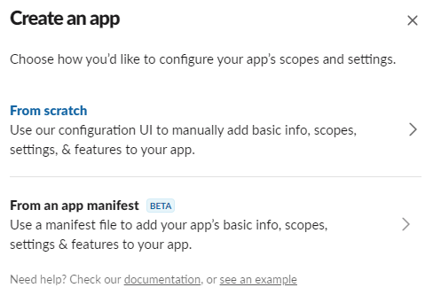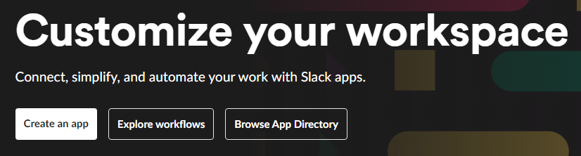 app name 입력하고 Pick a workspace to develop your app in에 작업공간 선택해야함 (작업공간이 empty 나 선택안될경우에 Slack 가입후 팀명 등록을 하면 뜸) Create App 클릭
