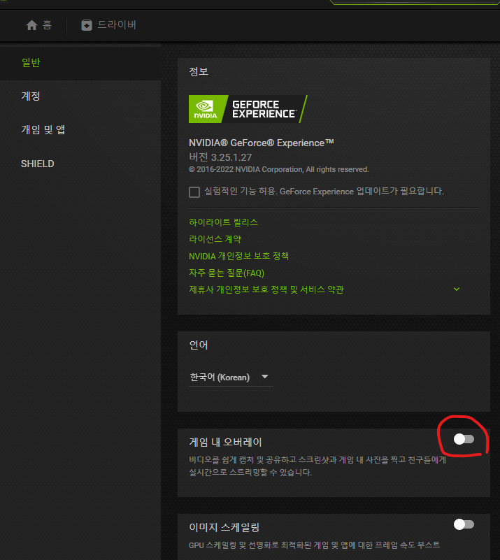vscode나 파이참 기타 개발툴에서 ALT + F12 먹통일때 nvidia geforce experience 때문에 키입력이 씹히는것 nvidia geforce experience를 삭제하거나해서 그래픽드라이버만 설치하거나 nvidia geforce experience를 띄워서 설정 들어가서 게임오버레이를 끄면됨'파이썬' 카테고리의 다른 글